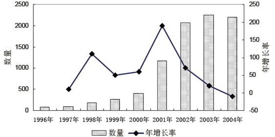 98.根据上图,1996年至2004年,城市最低生活保障人数年增长率最高的年份是哪一年?
