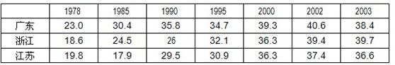 C.从1978年至2003年,浙江第三产业占GDP比重增长率高于广东和江苏。