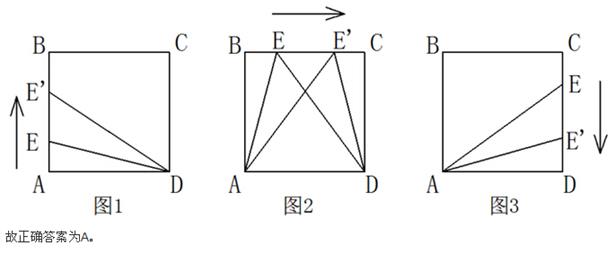 小蚂蚁从A点到B点的过程中,三角形AED的底为AD,长度不变,高AE随着小蚂蚁向上爬而增长,故三角形AED的面积随时间增长(如图1所示);小蚂蚁从B点到C点的过程中,三角形AED的底为AD,长度不变,高为正方形的边长10cm,也不变,故三角形AED的面积不随时间变化一直相等(如图2所示);小蚂蚁从C点到D点的过程中,三角形AED的底为AD,长度不变,高DE随着小蚂蚁向下爬而减少,故三角形AED的面积随时间减少(如图3所示)。只有A项符合三角形AED面积随时间先增长,再不变最后减小的趋势。