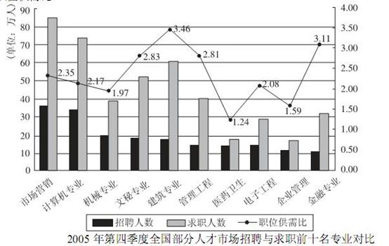 112.2004年,南京市人均可支配收入与常州市相比: A.高 B.低 C.一样 D.无法判断 113.下列说法错误的是: A.长三角16市中,人均可支配收入增长最快的城市其人均消费支出增长也最快 B.长三角16市中,人均消费支出最大的城市其人均可支配收入也最高 C.长三角16市中,人均可支配收入最低的城市其人均消费支出却不是最低 D.长三角16市中,人均可支配收入增长最慢的城市其人均消费支出增长也最慢 114.人均可支配收入增长比人均消费支出增长慢的城市个数是: A.4 B.5 C.6 D.7 115.下列区域人均可支配收入增幅最大的是: A.上海 B.江苏8市平均水平 C.浙江7市平均水平 D.长三角16市平均水平 三、图形资料(116~125题) (一)请根据下图所提供的信息回答问题: 请仔细观察下图,左侧Y轴表示各专业招聘人数与求职人数的总数,右侧Y轴表示各专业职位供需比。