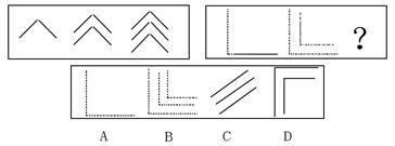 解答:从给出的左边四个图形分析,第一个图形是一个向上直立的直线,后面几个图形中的直线逐渐向右倒,第五个图形的直线应该恰好倒下。因此,正确答案是D。