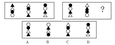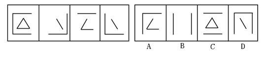 存在某种差异。要求你从四个选项中选择你认为最适合取代问号的一个。正确的答案应不仅使两套图形表现出最大的相似性,而且使第二套图形也表现出自己的特征。
