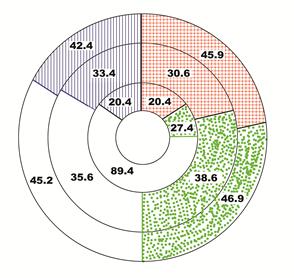 B解析:根据图形,外环企业2003年到2005年利润为46.9—45.2—42.4;属于连续递减;中环企业从38.6—35.6—33.4也是连续递减;内环企业从27.4—89.4—20.4不是连续递减;因此选择B。