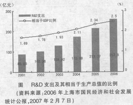 为了响应国家关于“创建创新型国家”的号召。上海市政府着眼于实际情况,对上海的科技创新体系建设深入推进。2006年内颁布了《上海中长期科学和技术发展规划纲要》,出台与之相关的367条配套政策及实施细则。全年用于研究与试验发展(R&D)经费支出257.9亿元,相当于全市生产总值的比例为2.5%(见下图)。