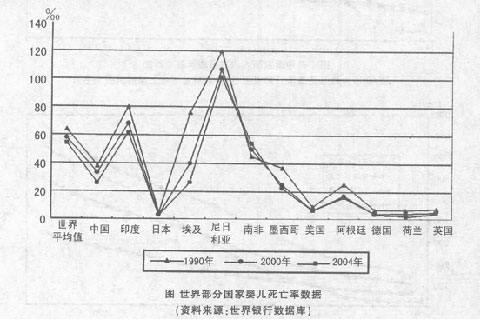 以下数据是对于世界部分国家在1990年、2000年和2004年的婴儿出生死亡率