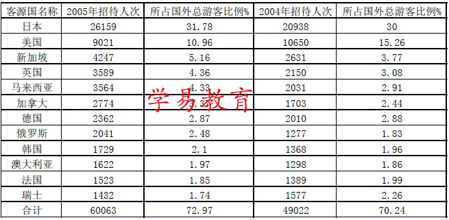 C、2005年与2004年相比,该市主要客源国中亚洲的游客比例有所增加