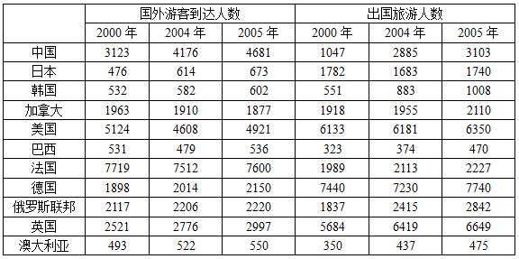 101.表中2005年国外游客达到人数高于出国旅游人数的国家有()