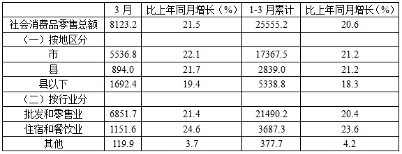 2008年我国第一季度社会消费品零售总额统计表 单位:亿元