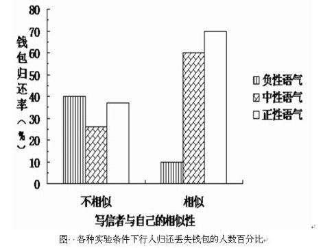 在所有情况下,钱包和里面的东西都是一样的,有变化的是写给钱包主人的信。在一种实验条件下,写信者是与这些路人相似的人(即一个能流利使用英语、像本地人的写信者);而在另一种实验条件下,写信者则是一个与路人不同的人(即一个几乎完全不懂英语的外国人)。另一个实验条件是不同的写信语气。在1/3的情况下,写信者用一种非常客气的语气(正性语气)写这封信,在另外1/3的情况下用一种中性的语气写信,在剩下1/3的情况下则是用一种不太客气的语气(负性语气)写信。