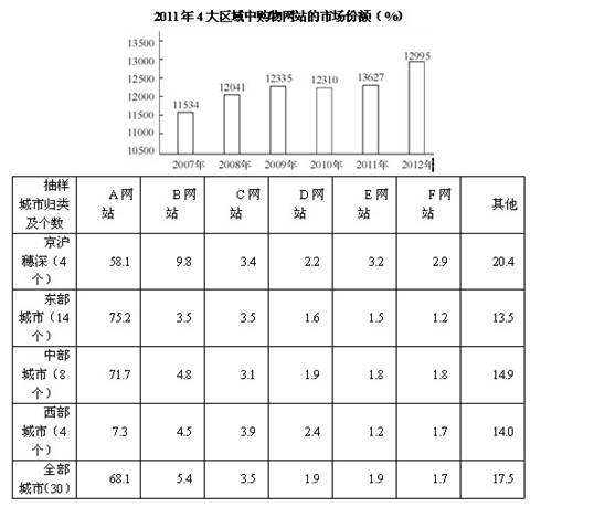 109.2011年上述表格所列购物网站中,有2个以上区域市场比基抽样市场平均份额高10个百分点的是()