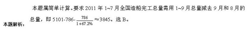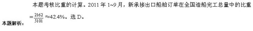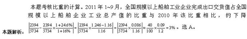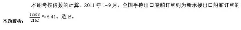 本题解析:本题属于文字分析题,考核读数和比重计算。 A选项,增长量计算。现期量大,增长率大,则增长量大。因此与手持船舶订单相比,2011年1~9月新承接船舶订单规模比去年同期下降得更少。A选项错误。B选项,材料未给出船舶工业总产值的数据。B选项错误。 C选项,基期量计算。2009年1~8月,船舶企业实现利润总额约为328÷(1+24.5%)÷(1+32.7%)≈199(亿元)。C选项正确。D选项,9月当月,我国船舶行业承担船舶订单94万载重吨,是2009年6月以来月度成交最低。因此,2011年1~9月,我国船舶行业月平均承接船舶订单规模应该高于94万吨。D选项错误。选C。