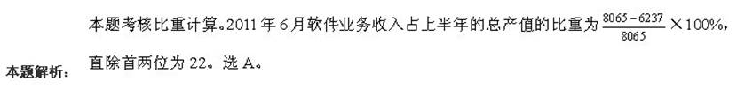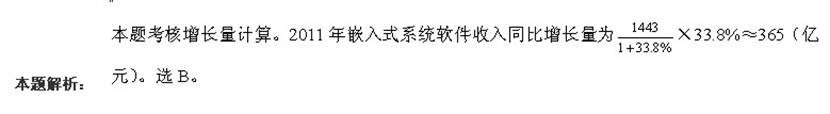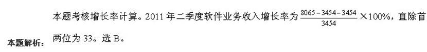 本题解析:本题考核现基期比重比较大小。要求2011年上半年收入占整个软件产业的比重高于上年同期的是哪一项数据,只需找出同比增速高于整个软件产业收入同比增速的那项数据即可,由第二段可知,只有嵌入式系统软件的增长率33.8%,高于上半年软件产业的增长率29.3%。选B。