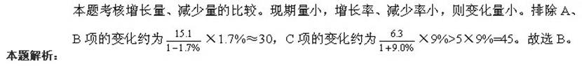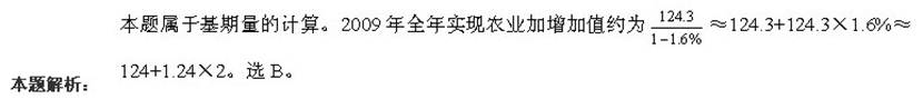 本题解析:本题属于综合分析题,考核直接读数类。A选项,粮食产量115.7,蔬菜产量303.0,粮食产量超过蔬菜产量的1/3。A选项错误。B选项,水产品增长,所以并非均有所下降。B选项错误。C选项,2009年该市观光园数量为1303-9=1294(个)。C选项错误。选D。