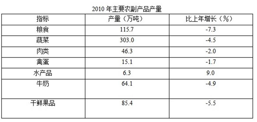 二、某市2010年全年实现农业增加值124.3亿元,比上年下降1.6%。粮食播种面积22.3万公顷,比上年减少0.3万公顷;粮食产量115.7万吨,比上年下降7.3%。