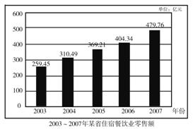 某省住宿餐饮业零售额增长迅速(如图所示),2003年住宿餐饮业零售额仅为259.45亿元,2006年突破400亿元,至2007年高达479.76亿元。2006年该省限额以上餐饮企业商品零售额为342952万元,比上年增加63012万元,增长22.5%,占当年该省全社会商品零售总额的比重为1.21%。按登记注册类型分组来看,2006年内资企业商品零售额为280308万元,增长34.3%,港澳台商投资企业商品零售额13589万元,增长1623%,外商投资企业商品零售额149056万元,下降25.7%。按国民经济行业分组来看, 2006年正餐零售额280737万元,增长38.4%;快餐零售额54929万元,比上年下降21.8%;其他餐饮零售额6534万元,比上年下降0.95%。