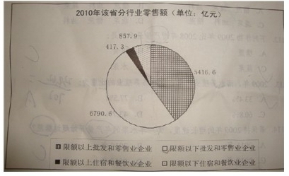 116.以下说法正确的是( ) A.2010年该省社会消费品分月零售额增幅最大的是12月份 B.2009年该省社会消费品分月零售额最大的是12月份 C.2010年该省限额以上企业零售额大于限额以下企业零售额 D.该省2009年5月社会消费零售额为941.5亿元 117.已知2010年该省限额以下批发和零售企业零售额相比于2009年同期增幅为18.7%,那么2009年该省限额以下批发和零售企业零售额均为( ) A.5720亿元 B.4563亿元 C.772亿元 D.351亿元 118.已知2010年限额以上企业零售额增幅为27.4%,限额以下企业零售额增幅为12.8%,那么2009年限额以下企业和限额以上企业零售额差值比2010年差值( ) A.约多386亿元 B.约少386亿元 C.约少674亿元 D.约少647亿元 119.该省2010年社会消费品零售总额是( ) A.13482.4亿元 B.11959.6亿元 C.14852.6亿元 D.16347.2亿元 120.以下说法错误的是( ) A.2010年3月的零售额在12个月中是最小的 B.2010年1月的零售额增幅在12个月中是最小的 C.2010年批发零售业零售额占社会消费品零售总额的比重超过50% D.2010年限额以上企业零售额占社会消费品零售总额的比重超过50%