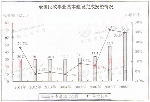 2008年,全国民政事业基本建设完成投资总额为66.6亿元,施工项目为3906个,完成投资总额比上年增长39.6%。其中国家投资26.6亿元,比上年增长83.4%。在投资总额中,用于优抚安置事业单位投资为9.6亿元,比上年增长88.2%;社区服务单位投资为5.2亿元,比上年增长52.9%;收养性单位投资为30.4亿元,比上年增长33.9%;殡仪服务单位投资为11.3亿元,比上年增长21.3%;救助类单位投资为2.6亿元,比上年增长100%;其他事业单位投资为7.5亿元,比上年增长27.1%。