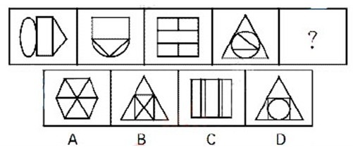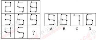 【解析】B。题干图形的封闭区域数依次是3、4、5、6,应选择封闭区域数为7的图形,选项中只有B。