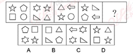 【解析】A。每个方框中的四个小图形的形状都是互不相同的,且每个方框中都有一个五角星,据此确定本题答案为A。