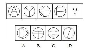 【解析】B。题干图形的共同特征是圆内部的线条数都为3,且这3条线与圆有3个接触点,据此确定本题答案为B。