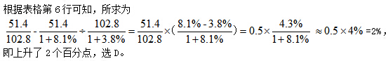 【解析】D。根据两个表格第3行可知,房地产业和工业二季度企业家信心指数同比下降,可排除A、B。社会服务业同比增加136.4-132.9=1.5,住宿和餐饮业同比增加131.8-127.8=4,则上升最多的是D。