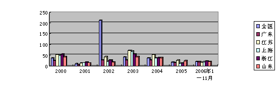 91.2005年1-10月,贵州省的固定资产投资额与甘肃省相比: A.较低 B.较高 C.恰好相等 D.无法比较 92.2006年1-10月,四川、重庆两地的固定资产投资总额比上年同期增长了约百分之几? A.29 B.30 C.31 D.32 93.下列关于表中西部省市区2006年1-10月固定资产投资的说法错误的是: A.固定资产投资最多的三个地区的固定资产同比增长率也最大 B.固定资产投资最少的三个地区固定资产同比增长率也最小 C.总体上说,固定资产投资较多的地区的 D.固定资产投资较多的地区的固定资产投资同比增长率也较高,反之亦然 94.2006年1-10月,表内西部省市区中,不同地区的固定资产投资差距最大达: A.2955.33亿元 B.2065.21亿元 C.1878.36亿元 D.1722.98亿元 95.以2006年10个月的固定资产投资水平估算后两个月的固定资产投资水平,以2006年的前10个月的固定资产投资同比增长率估算固定资产投资的年增长率,可估算出2008年固定资产投资额在4000亿元以上的表中西部省市区有几个? A.1 B.2 C.3 D.4 三、图形资料(96-100题) 全国及粤苏沪浙鲁进口增长情况(%)