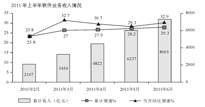2011年上半年,我国软件产业实现软件业务收入8065亿元。同比增长29.3%,增速比去年同期高0.2个百分点:实现利润103亿元,同比增长34.9%。其中,6月份完成软件业务收入1828亿元,同比增长32.9%,增速比5月份回升3.6个百分点。