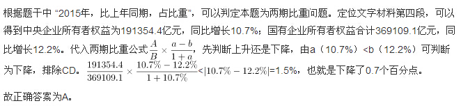 117、正确答案是D, 解析: 根据题干中 “2015年,同比上升,占比重”,可以判定本题为两期比重问题。此题只需比较部分量的增长率a和整体量的增长率b,a>b为上升。定位文字材料第二段,销售费用的增长率a(下降2.9%)、管理费用的增长率a(增长2.3%)及财务费用的增长率a(增长7.3%)均大于国有企业营业总成本的增长率b(下降5.1%),即比重上升;因此,比重上升的有3项。故正确答案为D。