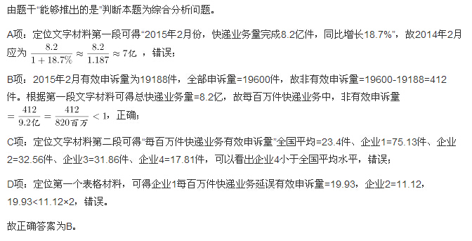 122、正确答案是A, 解析 由题干“2015年2月”判断现期,“消费者对快递业务的全部申诉量”和文字材料第一段“占全部申诉量的97.6%”判断本题为现期比重中总量的计算问题。定位文字材料第一段“2015年2月份,快递业务量完成8.2亿件”和文字材料第二段“2015年2月,全国每百万件快递业务中有效申诉量为23.4件”可得8.2亿=820百万快递业务中有效申诉量=820×23.4=19188件,全部申诉量=19188÷97.6%略大于1.9万件,与A项最接近。 故正确答案为A。