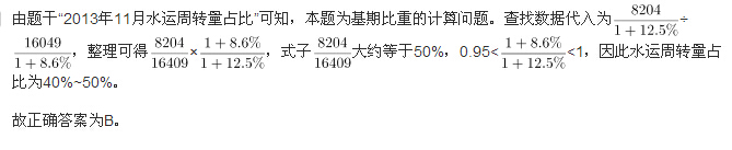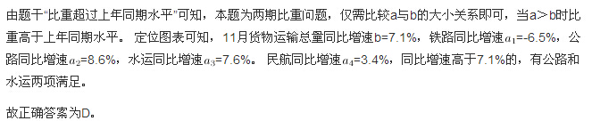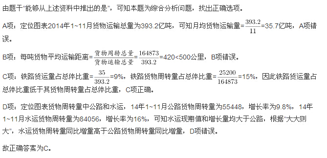 134、正确答案是D,解析:由题干“2013年1~10月我国货运运输总量最大的领域”可知,本题是基期比较问题,比较各领域1~10月基期货物运输总量即可。观察图表可知,各领域1~11月和11月同比增速相差不大,故本题可直接比较1~10月现期值。铁路=35-3.2=31.8亿吨,公路=303.6-30.7=272.9亿吨,水运=54.5-5.4=49.1亿吨,民航=538-55.5=482.5万吨,可明显看出公路272.9亿吨最大。(注意单位,1亿吨=10000万吨)