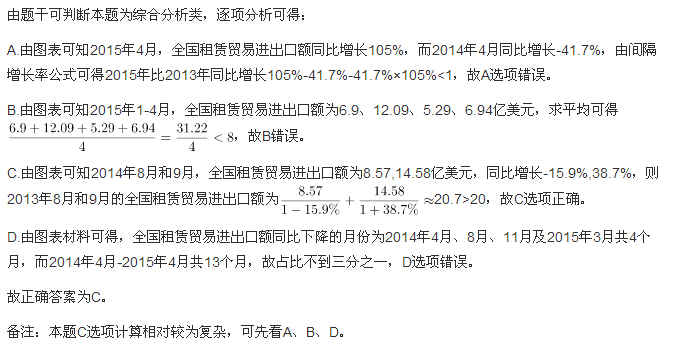 130、正确答案是C,解析: 定位图表可知2014年4月-2015年4月各月租赁贸易进出口额,故求2014年下半年进出口总额,可判定此题为简单加减计算问题。
