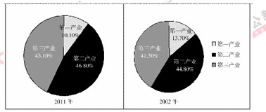 D.与2002年相比,2011年我国三次产业的比例结构更加协调