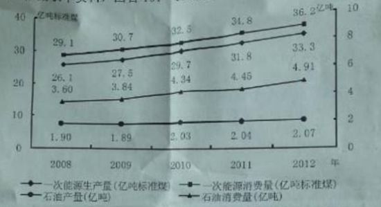 图1 2008~2012年全国一次能源、石油生产量与消费量的情况