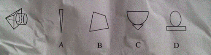 75.左边的图形是圆柱体和四棱锥体的组合,如果从任一面剖开,以下哪一个不可能是该立体图形的截面( )