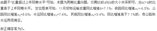 102.D 由题干”2013年1~10月我国货运运输总量最大的领域“可知,本题是基期比较问题,比较各领域1~10月基期货物运输总量即可。观察图表可知,各领域1~11月和11月同比增速相差不大,故本题可直接比较1~10月现期值。铁路=35-3.2=31.8亿吨,公路=303.6-30.7=272.9亿吨,水运=54.5-5.4=49.1亿吨,民航=538-55.5=482.5万吨,可明显看出公路272.9亿吨最大。(注意单位,1亿吨=10000万吨)故正确答案为D。