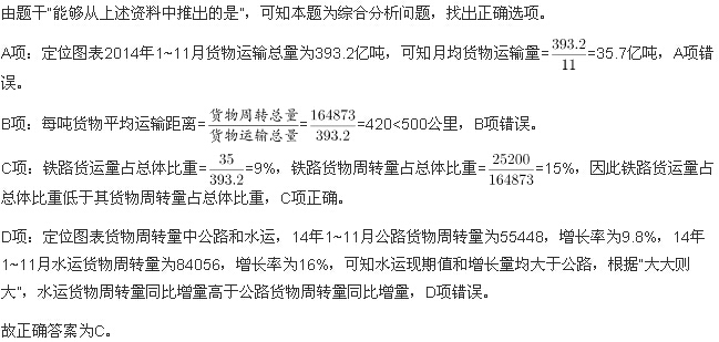101.B 定位表格2014年货物运输总量1~11月393.2亿吨,11月39.3亿吨,故求2014年1~10月货物运输总量,可判定此题为简单加减计算问题。2014年1~10月我国货物运输总量=393.2-39.3=353.9。故正确答案为B。