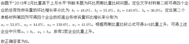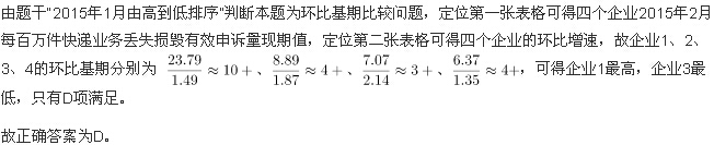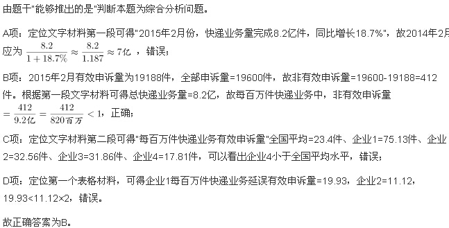 由题干”2015年2月“判断现期,”消费者对快递业务的全部申诉量“和文字材料第一段”占全部申诉量的97.6%“判断本题为现期比重中总量的计算问题。定位文字材料第一段”2015年2月份,快递业务量完成8.2亿件“和文字材料第二段”2015年2月,全国每百万件快递业务中有效申诉量为23.4件“可得8.2亿=820百万快递业务中有效申诉量=820×23.4=19188件,全部申诉量=19188÷97.6%略大于1.9万件,与A项最接近。