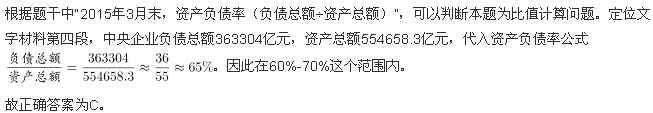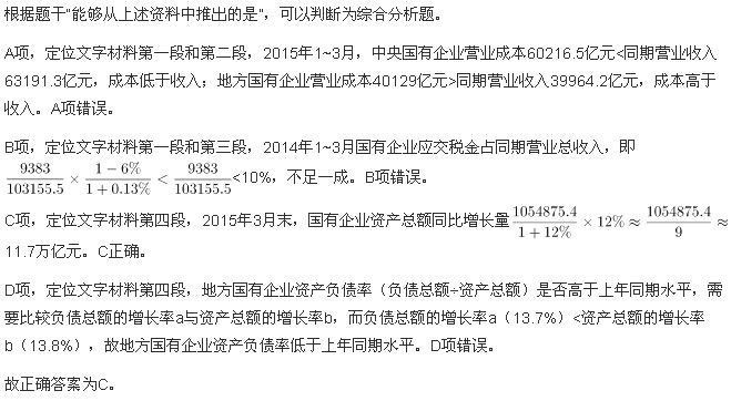 根据题干中 “2015年,同比上升,占比重”,可以判定本题为两期比重问题。此题只需比较部分量的增长率a和整体量的增长率b,a>b为上升。定位文字材料第二段,销售费用的增长率a(下降2.9%)、管理费用的增长率a(增长2.3%)及财务费用的增长率a(增长7.3%)均大于国有企业营业总成本的增长率b(下降5.1%),即比重上升;因此,比重上升的有3项。 故正确答案为D。