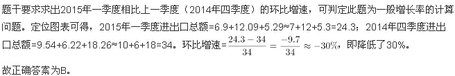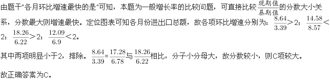 119.B 由题干可知本题是找全国租赁贸易总额及同比增长率均高于上月的月份数,可判定本题为直接找数问题。定位图表材料,观察全国贸易总额及增长率均高于上月的有2014年5、7、9、1