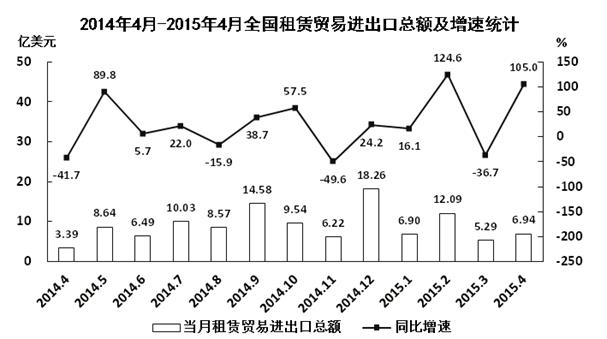 B.2015年1~4月全国租赁贸易进出口额月均超过8亿美元