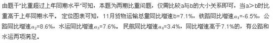 D项:定位图表货物周转量^91考试网路和水运,14年1~11月公路货物周转量为55448,增长率为9.8%,14年1~11月水运货物周转量为84056,增长率为16%,可知水运现期值和增长量均大于公路,根据“大大则大”,水运货物周转量同比增量高于公路货物周转量同比增量,D项错误。
