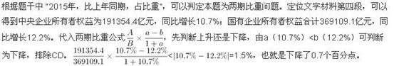 根据题干中 “2015年,同比上升,占比重”,可以判定本题为两期比重问题。此题只需比较部分量的增长率a和整体量的增长率b,a>b为上升。定位文字材料第二段,销售费用的增长率a(下降2.9%)、管理费用的增长率a(增长2.3%)及财务费用的增长率a(增长7.3%)均大于国有企业营业总成本的增长率b(下降5.1%),即比重上升;因此,比重上升的有3项。