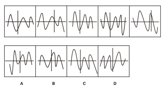 87.在题干中给出一套图形,其中有五个图,这五个图呈现一定的规律性。在给出的另一套图形中,有四个图,从中选出唯一的一项作为保持左边五个图规律性的第六个图。