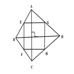 63、【解析】D。根据题意,如下图。E、F、G、H是四边形ABCD的中点。且EFHG为矩形,根据EF平行AC,FH平行于BD,且EF和GH垂直,则AC与BD垂直。因此,四边形ABCD为对角线互相垂直的四边形。答案选择D。