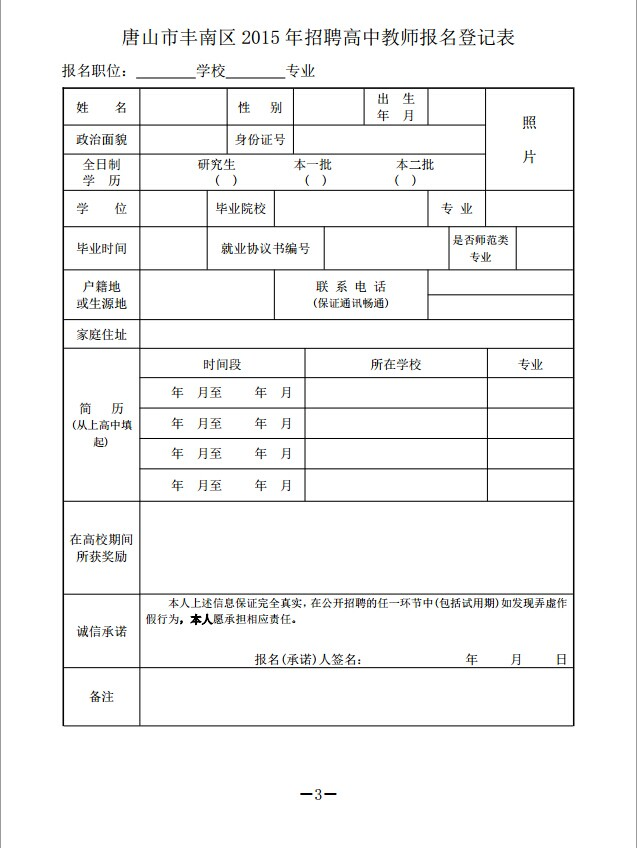 另填写《唐山市丰南区2015年招聘高中教师报名登记表》(贴小二寸近期免