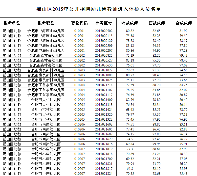 一、蜀山区2015年公开招聘幼儿园教师进入体检人员名单(见附件)
