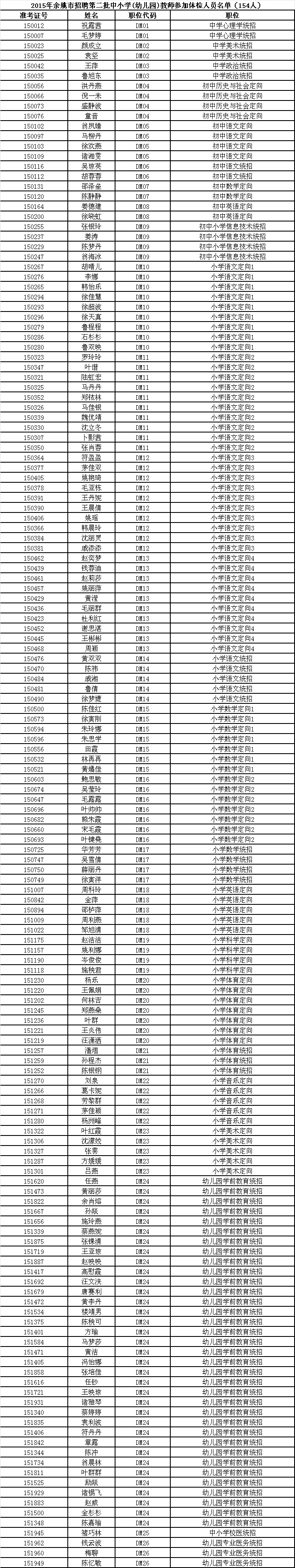 2. 2015年余姚市招聘第二批中小学(幼儿园)教师体检合格人员。