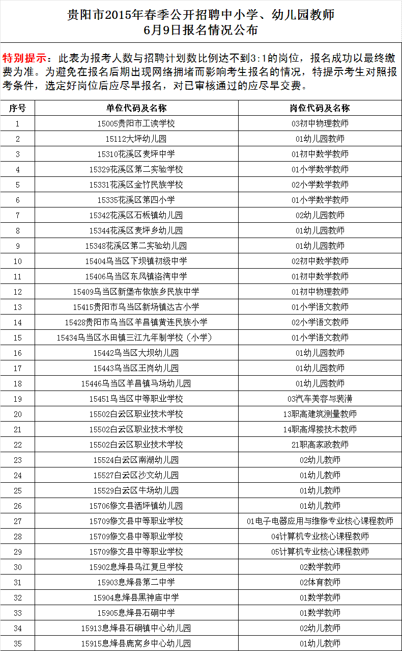2015年06月春季贵州贵阳市中小学、幼儿园教师招聘报名情况公布6.9