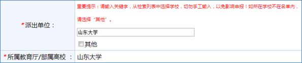 注意:派出单位填写山东大学,所属教育厅/部属高校自动生成山东大学,如下图: