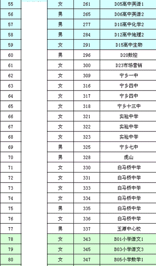 经组织体检,下列100名受检对象体检合格,进入考察程序,现予公示。11名孕期受检对象因部分体检项目未做,暂不作体检结论,但进入考察程序,相关聘用手续待生产完毕体检合格后再办理 。请入围考察人员及孕期受检对象于7月18日前携带本人身份证到宁乡县教育局314室办理调档手续。